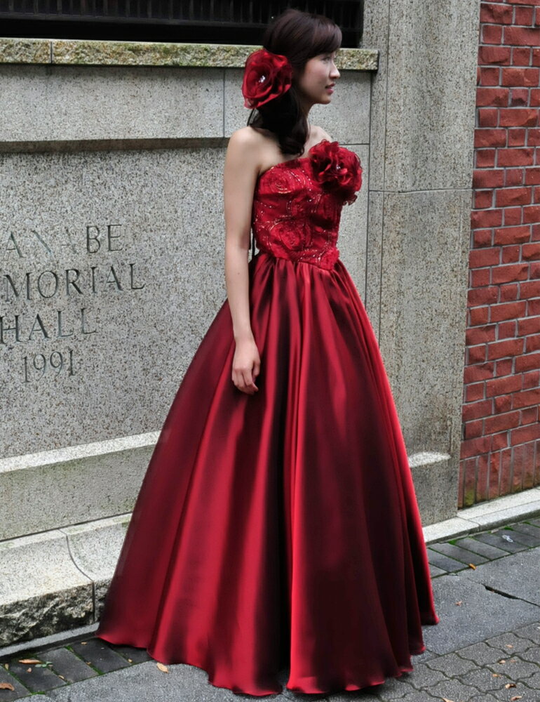 ビーズやオーガンジーで立体的な渦巻きを 描いたような刺繍が印象的な生地を使用した ストラップレス ドレスです。